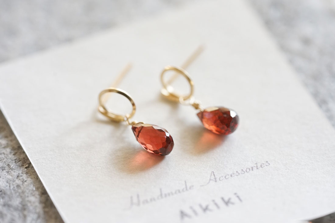 最上級AAAランクのモザンビークガーネットが揺れるピアス。スクエアワイヤーが上品なラインをつくり、知的な印象に。日常の装いにも、きちんと感を足したい日にも寄り添う一品です。