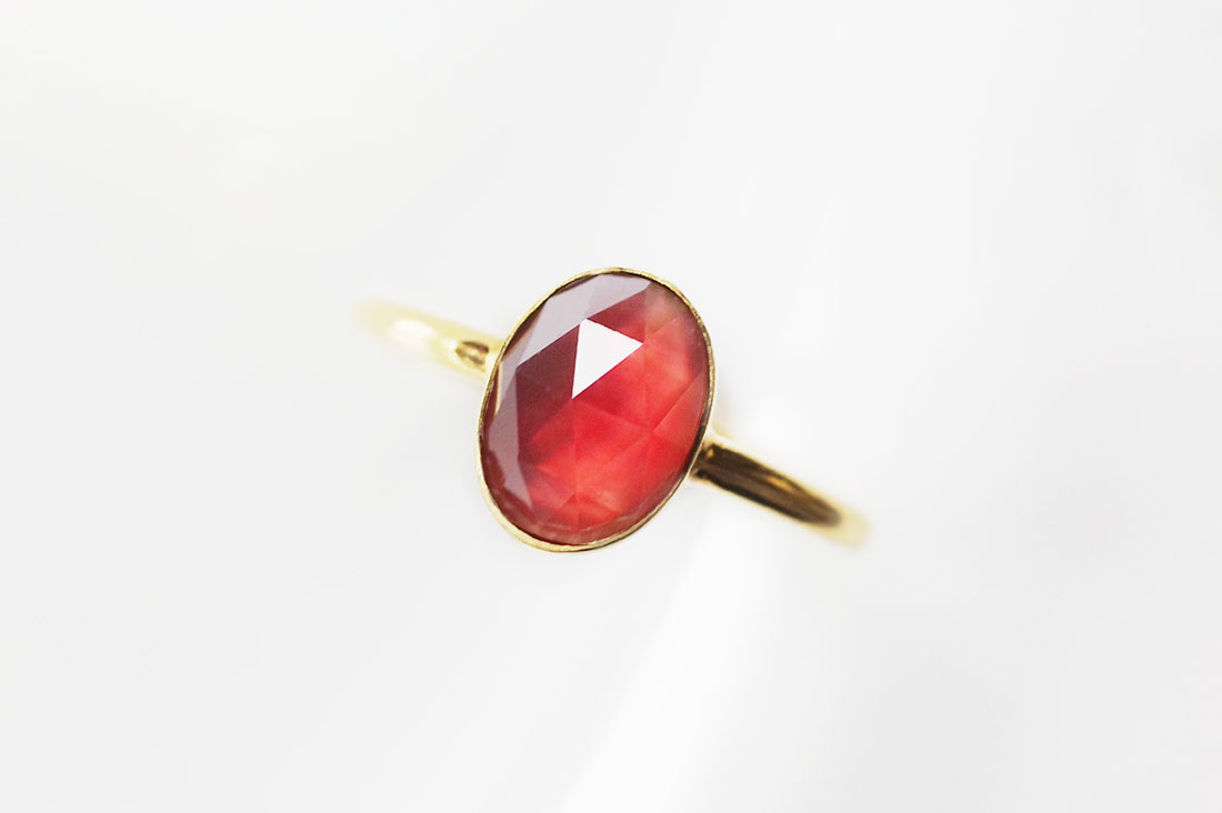 インド・オリッサ産の高品質ガーネットをシンプルなリングに仕立てた一点。透明感あるワインレッドの深みが手元を穏やかに彩り、リッチな立体感が気分を高めてくれるはず。