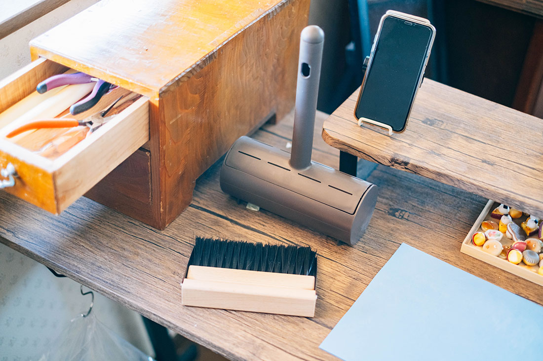 苦労を笑い飛ばすぽぼっと。さんですが、その言葉からは作品への妥協なき姿勢がうかがえます。アトリエに常備されたクリーナーは、ほんの小さなほこりも見逃さないという、プロフェッショナルとしての誇りの表れなのです。