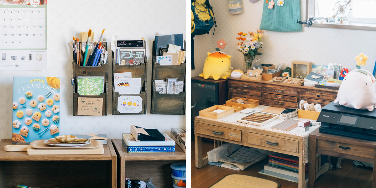 アンティークの雑貨やポストカードが飾られたアトリエは、まさに「ぽぼっと。ワールド」の秘密基地。「好きなものに囲まれていないと、楽しく作業ができなくて」と微笑むぽぼっと。さんの横には、作品のほこりを取るための「コロコロ」が常備され、かわいらしさの中に職人の眼差しが垣間見えます。
