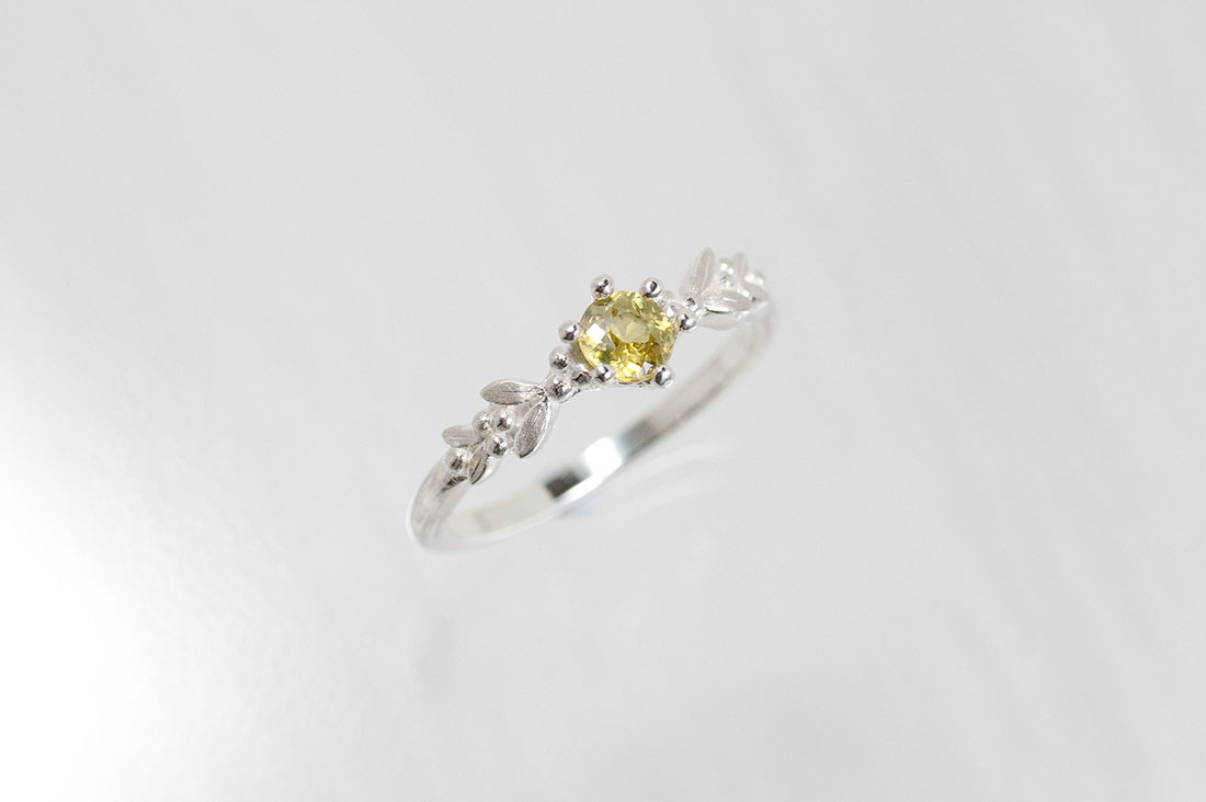 オリーブの花のつぶつぶした感じのかわいらしさ、花言葉である「平和」と、スフェーンのオリーブっぽい色合いにひかれて、昨年の9月に購入しました。届いてみるとびっくり。ベースはオリーブグリーンですが、角度によっては、分光器を通したような光の輝きが見えます。気分転換したいときに手元を眺めて、そのきらめきに癒やされています。