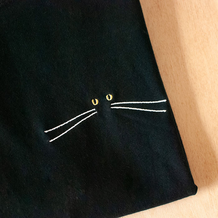 猫のきらりとした目とピンと張ったひげを、シンプルに刺繍で表現。上質な綿を使用したなめらかな質感と、オーバーサイズの5分袖でざっくりとラフに着こなせます。