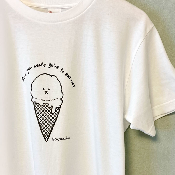 ビションフリーゼをモチーフにしたキャラクターがアイスクリームになった、シュールなイラストのTシャツ。「本当にわたしを食べるの?」と問うメッセージに、思わずふふっと笑ってしまいます。