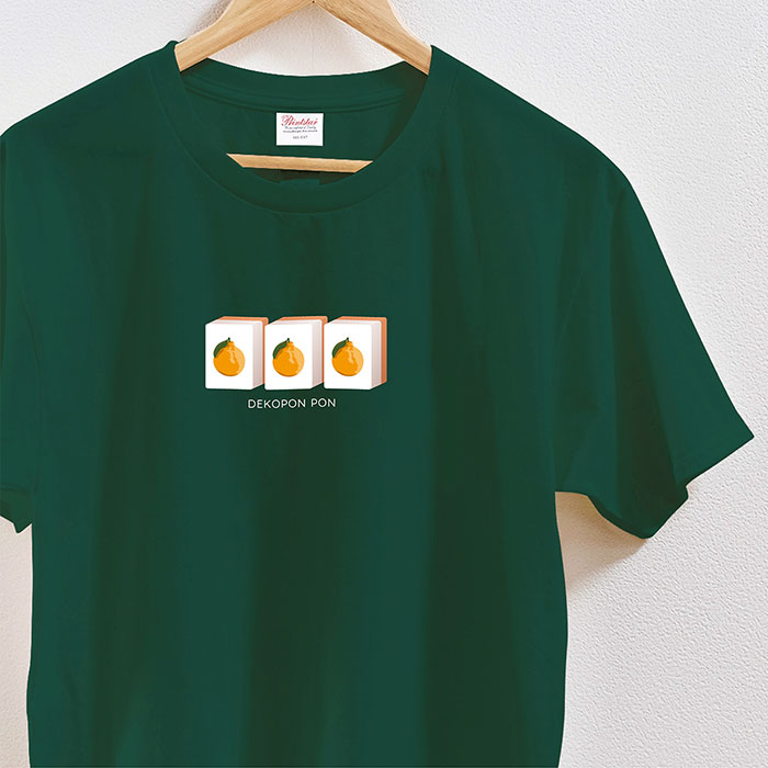 デコポンが3つそろって「ポン」と鳴く、麻雀用語のギミックが目を引くユーモアあふれるデザインです。柑橘ならではの爽やかさもあり、夏のカジュアルなお出かけにぴったりですよ。