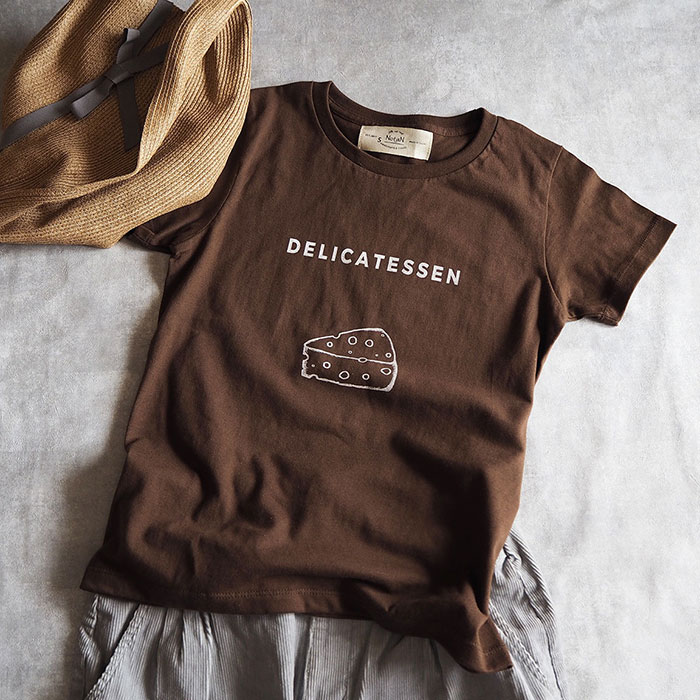 シックなブラウンの生地に、版画風のイラストとロゴをひとつひとつ手作業でプリントした一枚。子ども用サイズもあるので、親子でモチーフ違いのおそろいコーディネートも楽しめます。