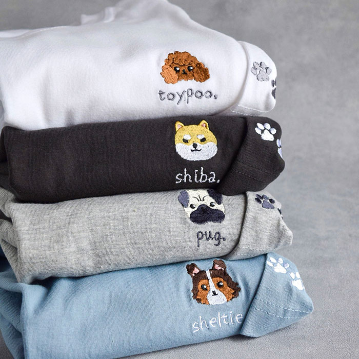 74種類もの犬種から選んで、自分だけのワンポイント刺繍を入れられるアイテムです。袖にはかわいらしい肉球のあしらいも。愛犬の名前を入れて楽しみたいですね。