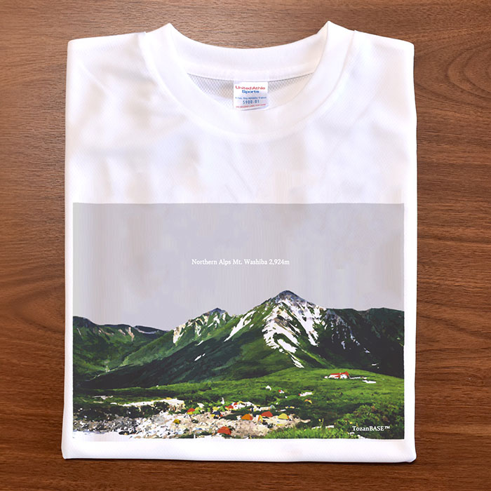 吸水と速乾に優れたドライ素材でつくられたホワイトカラーのTシャツ。美しい鷲羽岳の姿がプリントされた一枚です。登山のときはもちろん、日常でも山への思いを感じられますよ。